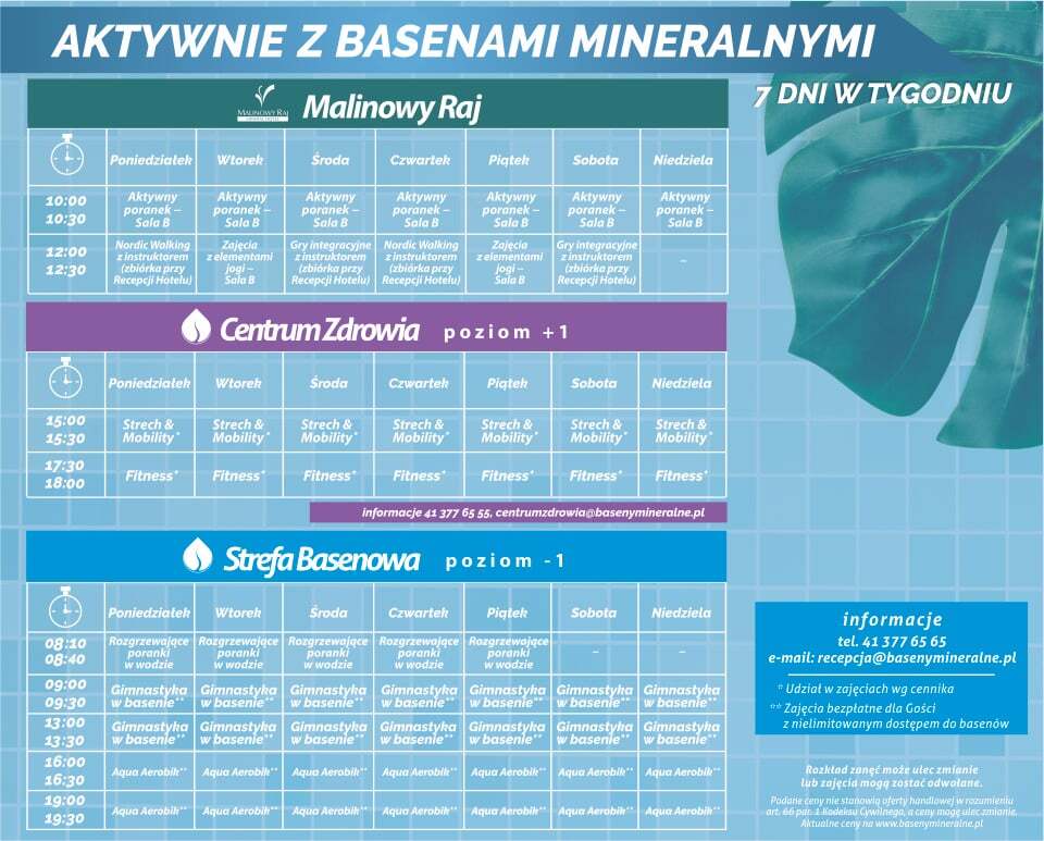 Ze powodów niezależnych od organizatora może zdarzyć się odwołanie zajęć zamieszczonych w grafiku. Zajęcia prowadzone są bez dodatkowej opłaty i nie ma możliwości rekompensowania za ich odwołanie. Zajęcia płatne mogą być przełożone na inny termin lub zwrot opłaty. Z przyczyn technicznych mogą być wyłączone z użytkowania urządzenia i wyposażenie sali fitness.