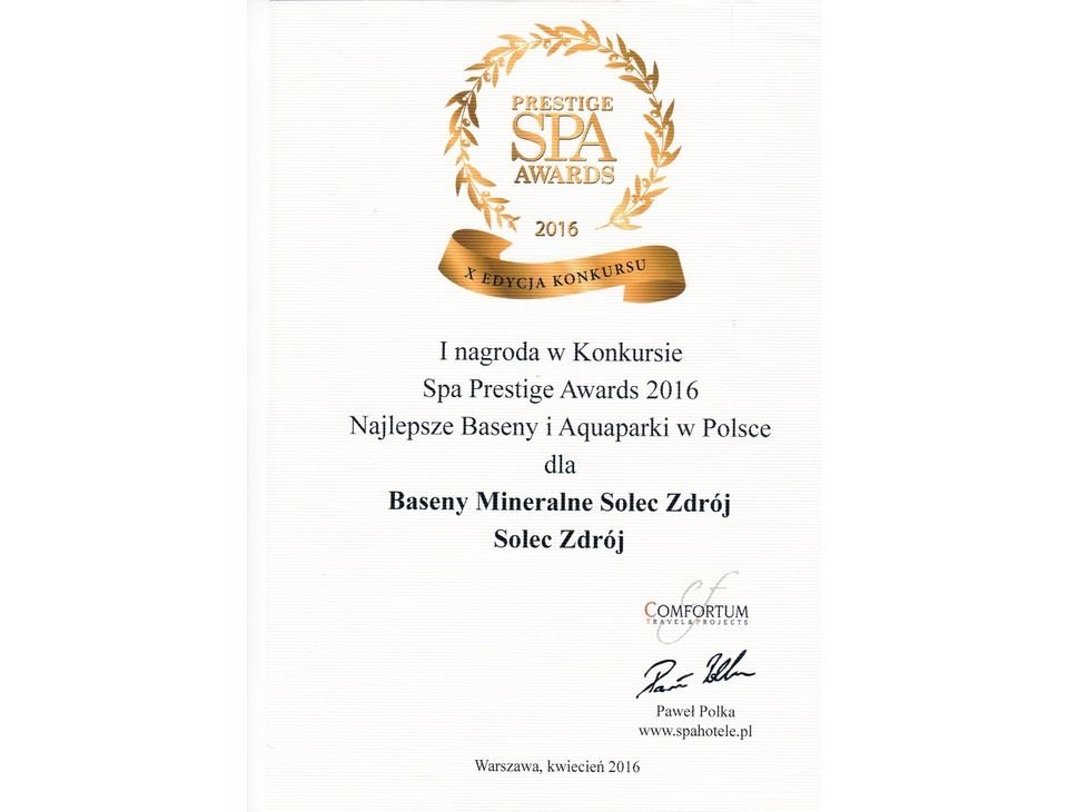 Baseny Mineralne Solec-Zdrój wraz z zapleczem hotelowym w postaci Hotelu**** Medical SPA Malinowy Zdrój otrzymały Certyfikat Polskiej Organizacji Turystycznej w Konkursie na Najlepszy Produkt Turystyczny w 2013 roku. To szczególne wyróżnienie ponieważ nasze Baseny Mineralne została docenione na tle ogólnopolskiej oferty turystycznej.