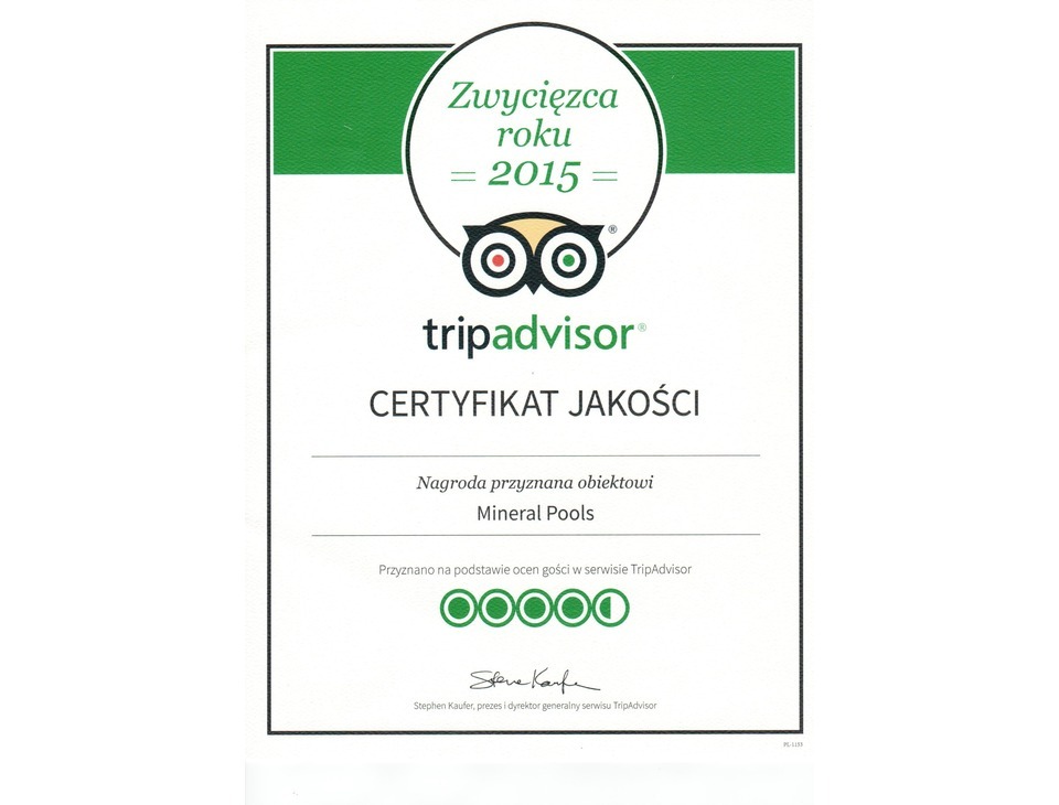 Certyfikat Jakości największego portalu turystycznego Trip Advisor przyznany na podstawie bardzo wyskoich ocen naszych gości. Dla nas to najwyższe wyróżnienie, gdyż jest wynikiem Państwa opinii.